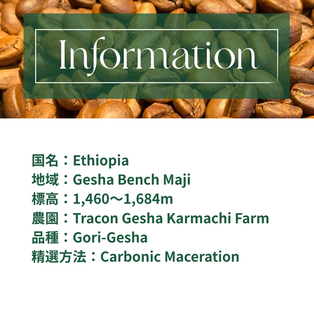 標高 1,460〜1,684m、Tracon Gesha Karmachi Farm で育ったこのロットは、Carbonic Maceration によって非常に強い発酵由来の風味を獲得しています。