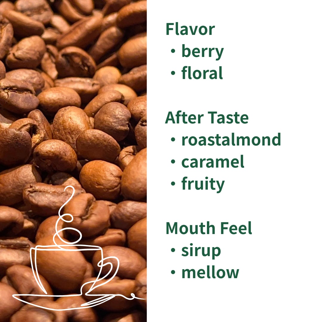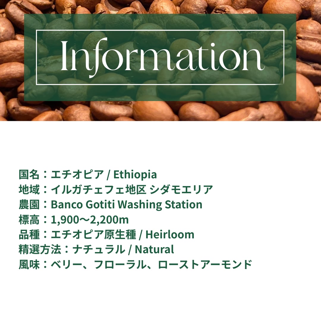 エチオピア原生種(Heirloom)をナチュラル精選する事で、フルーティーな甘さとコーヒー豆が持つフローラルな香りの両方が楽しめるコーヒーです。